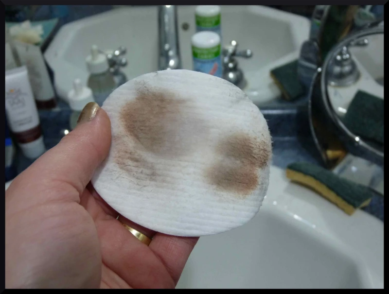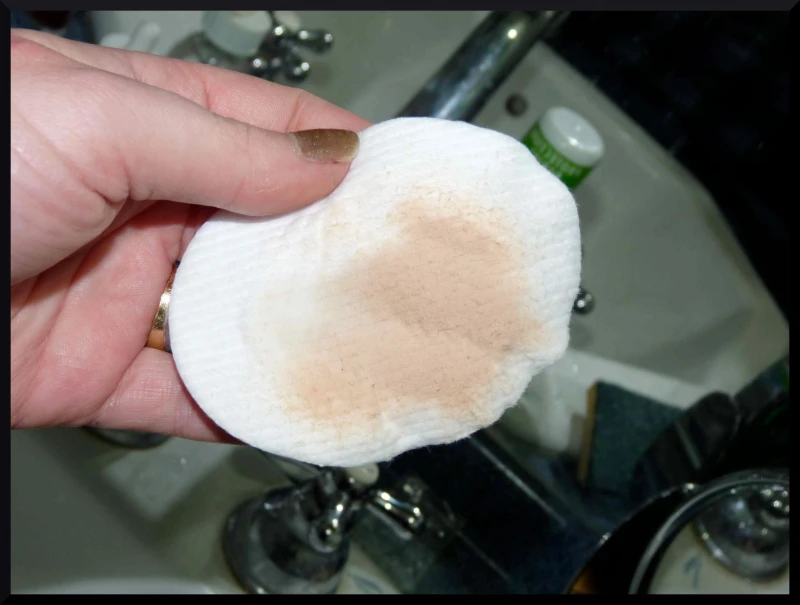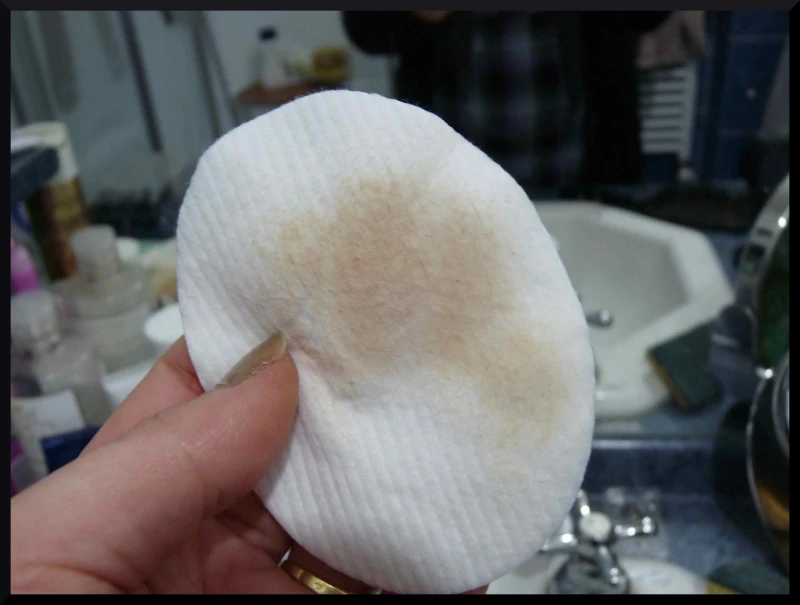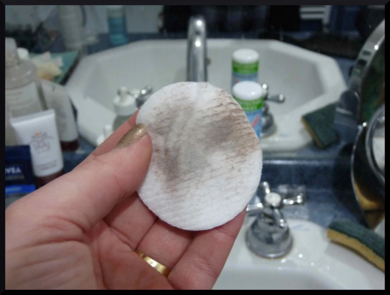 Ensuite pour revenir sur le côté nettoyant, j’ai décidé de passer sur mon visage un coton imbibé d’eau Bioderma Sebium pour constater si oui ou non, il reste des résidus de maquillage….Le résultat est éloquent et bien visible sur mes photos : OUI , il y a beaucoup de restes de make-up !