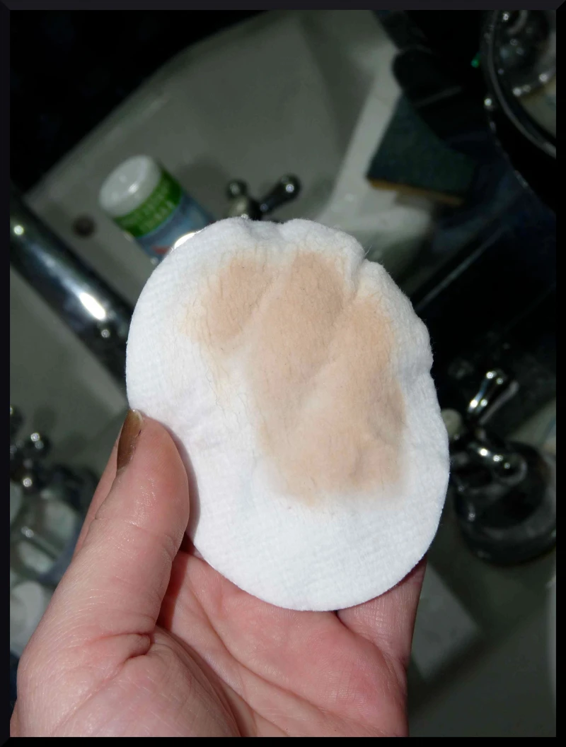 J’essaye de ne pas frotter comme une tarée, me remémorant sans cesse les conseils de la MUA qui m’avait auscultée : « foutez la paix à votre peau et soyez un peu gentille avec elle ». Du coup je passe le coton en appuyant quand même un peu ( on se refait pas ) :