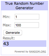 Le tirage au sort du gagnant s’effectuera grâce à Random, sous l’oeil affûté de Maître Musclor. Après révélation de son nom, il disposera de 4 jours ( 4 ans du blog toussa toussa ) pour m’envoyer ses coordonnées postales par email !