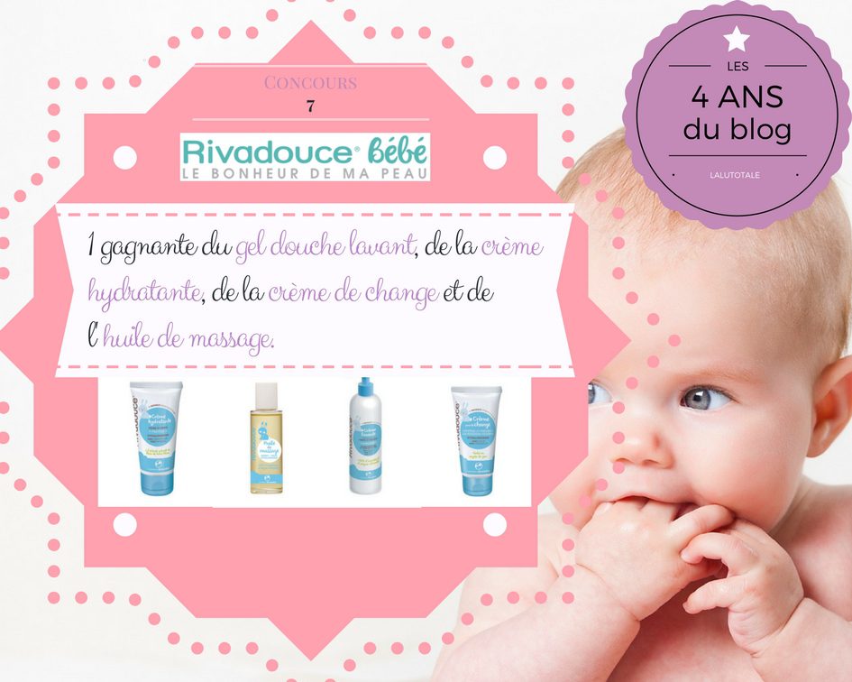 Vous n’êtes pas sans savoir que RIVADOUCE est la marque de produits d’hygiène pour bébés la plus distribuée dans les maternités. Et après les avoir testés, je comprends pourquoi ! Leur petite odeur légère et poudrée en fera craquer plus d’un #DingueDOdeurDeBébés ( sauf le caca ). Une chanceuse va donc avoir le privilège de remporter le lot de 4 produits suivants :