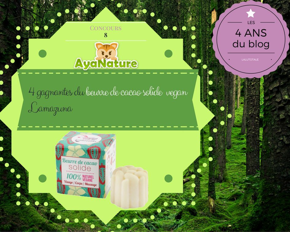 Et du coup, ce n’est pas un, mais quatre lots qu’AYANATURE met en jeu pour vous ! Quatre grosses veinardes vont avoir la chance de remporter le beurre de cacao vegan LAMAZUNA. Si vous saviez comme je les envie. Je suis limite à remplir moi-même mon propre formulaire de participation, hahaha.