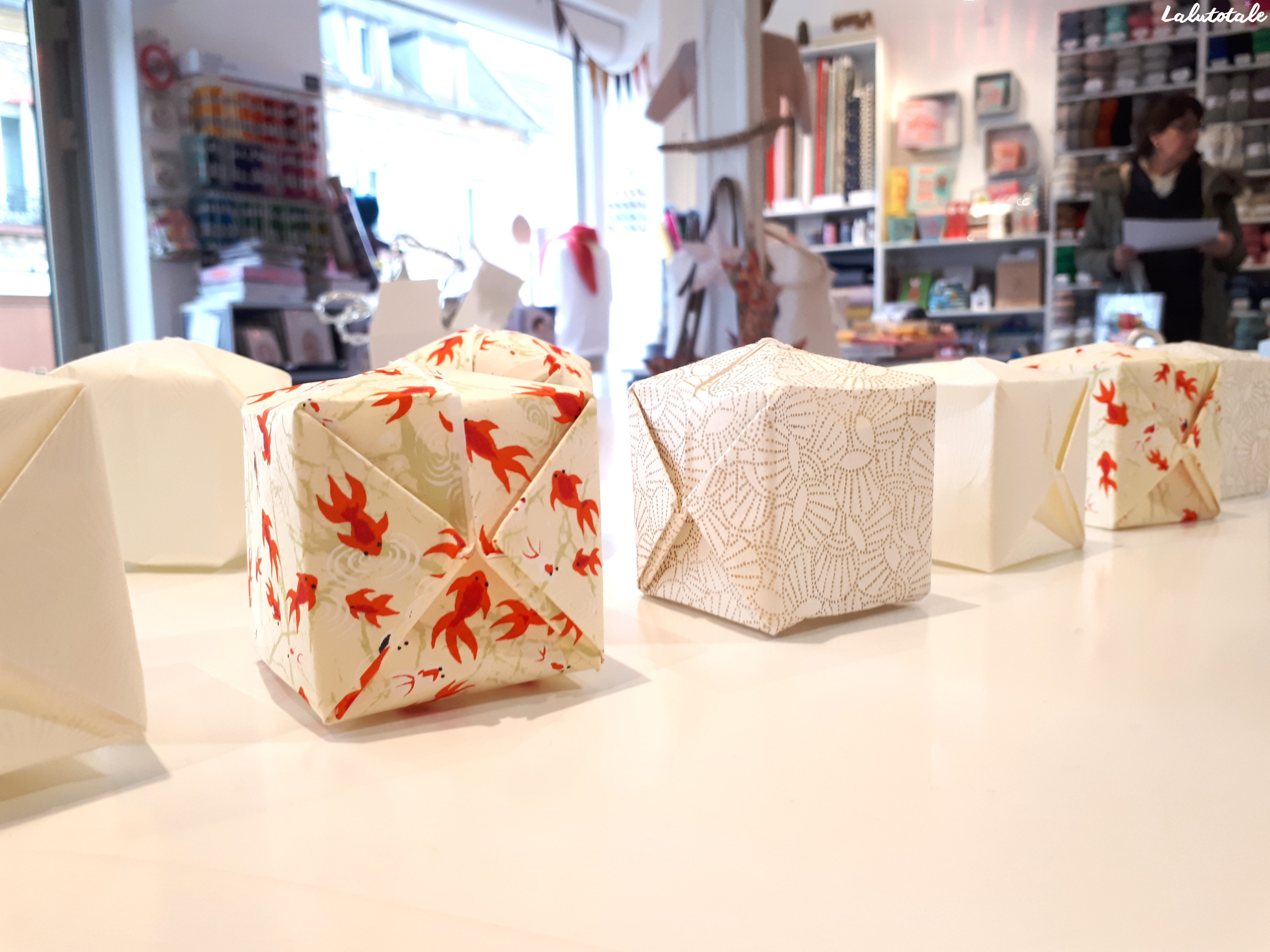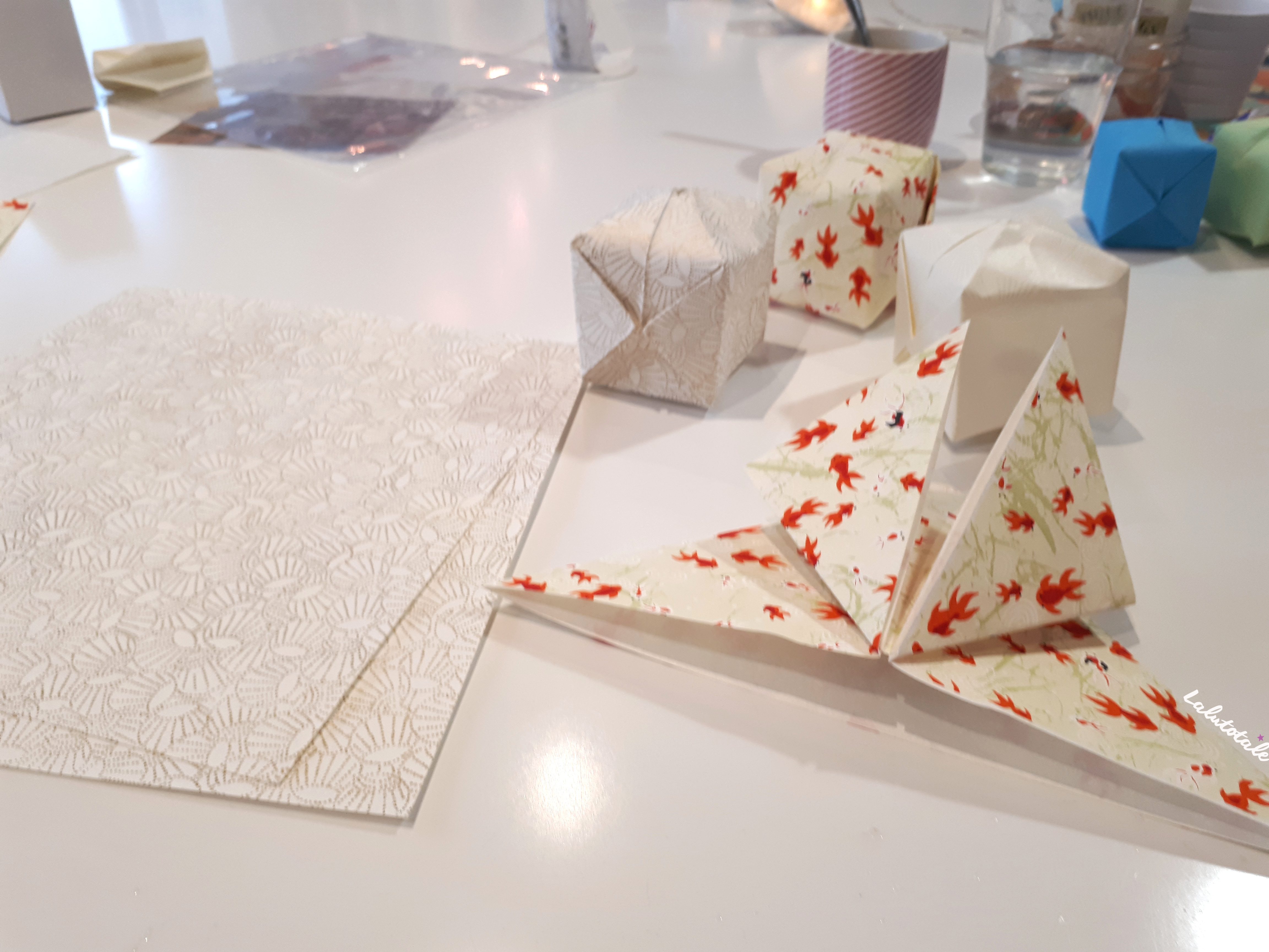 Pour mon atelier origami, je fus finalement toute seule car deux personnes avaient décommandé. Ce n’était pas pour me déplaire : j’étais ultra concentrée du coup, car je n’avais jamais touché de papier à origami avant cet atelier ! Fabienne a bien pris le temps de m’expliquer pas à pas, en me faisant tester sur du papier ordinaire avant de me lancer sur le vrai de vrai. Ces fameux petits papiers que j’ai pu choisir parmi des dizaines.