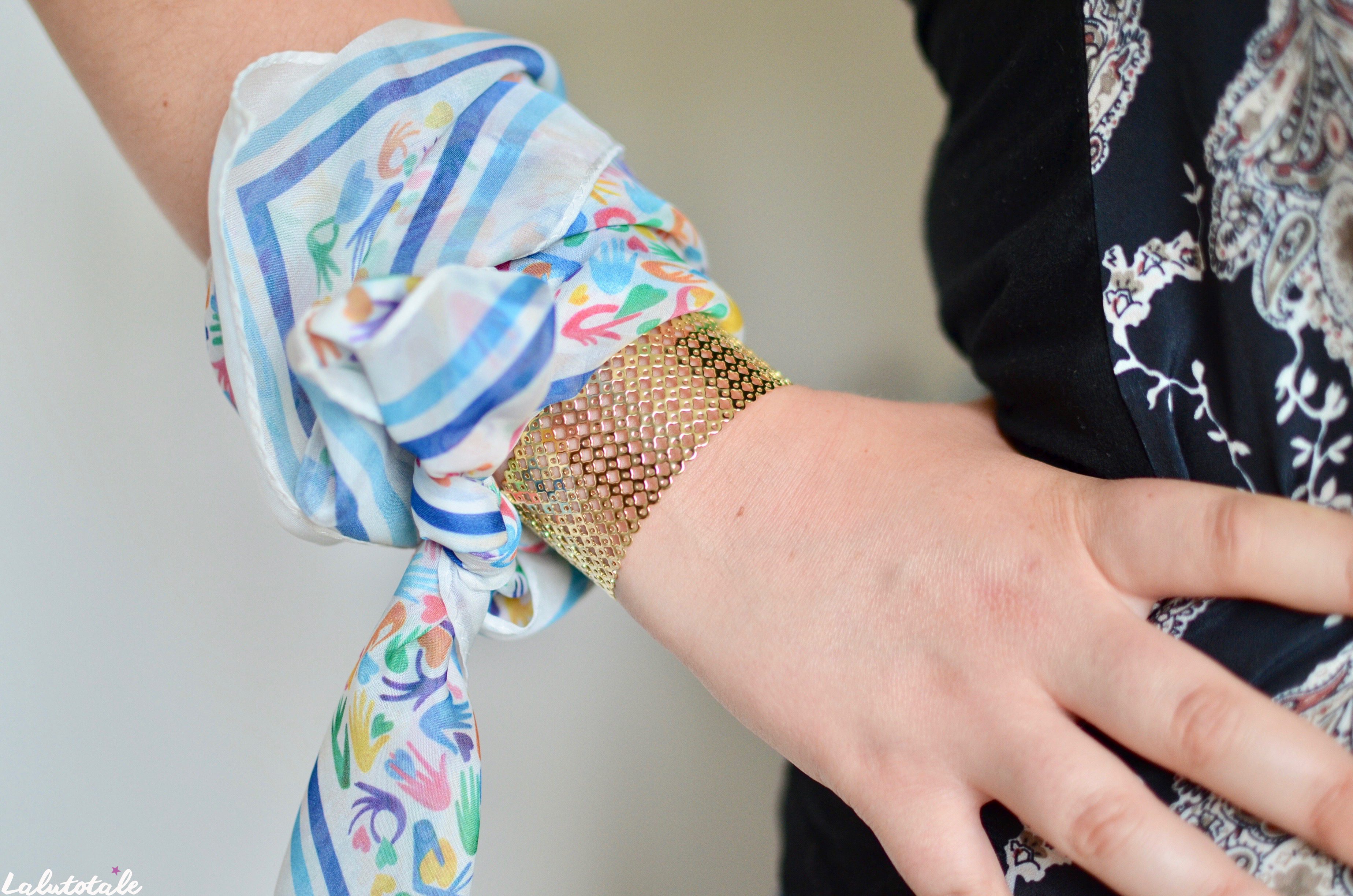 Je suis une buse pour nouer des foulards dans mes cheveux ( je suis une buse pour tout ce qui concerne ma tignasse ). Aussi, ce que je préfère, c’est le nouer nonchalamment autour de mon poignet ou autour de mon sac à main. Effet de style garanti !
