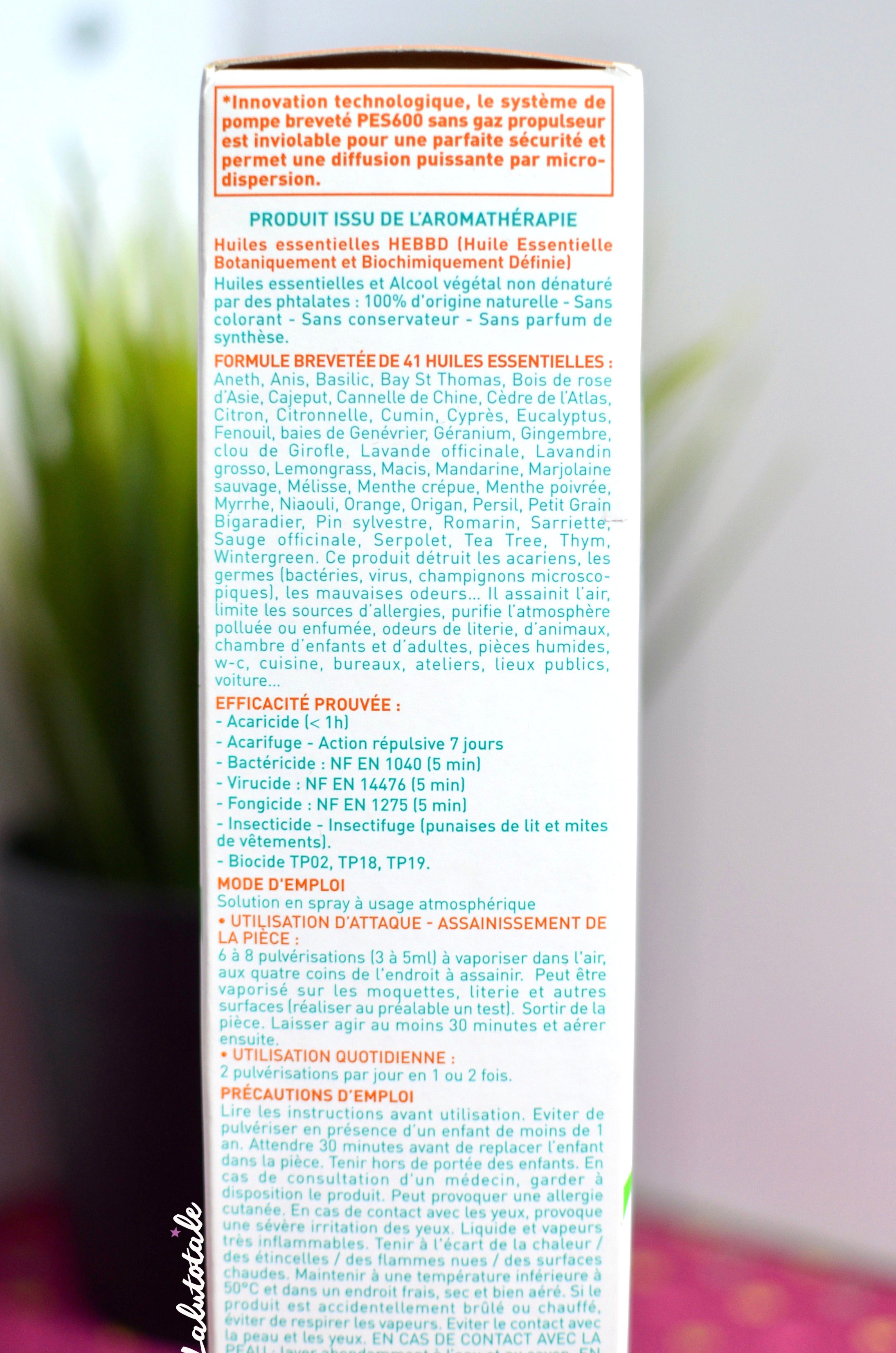 Pour les enfants de moins d’un an, il suffit de les éloigner de la pièce pshittée pendant 30 minutes. Pour les autres, c’est tout bon. Je pense que cette précaution est prise car le spray contient pas moins de 41 huiles essentielles. Vous voyez d’ailleurs le détail de ces huiles sur un des clichés ci-dessus ( je vais pas me farcir la liste à recopier hein, mon abnégation a des limites 😁 ).