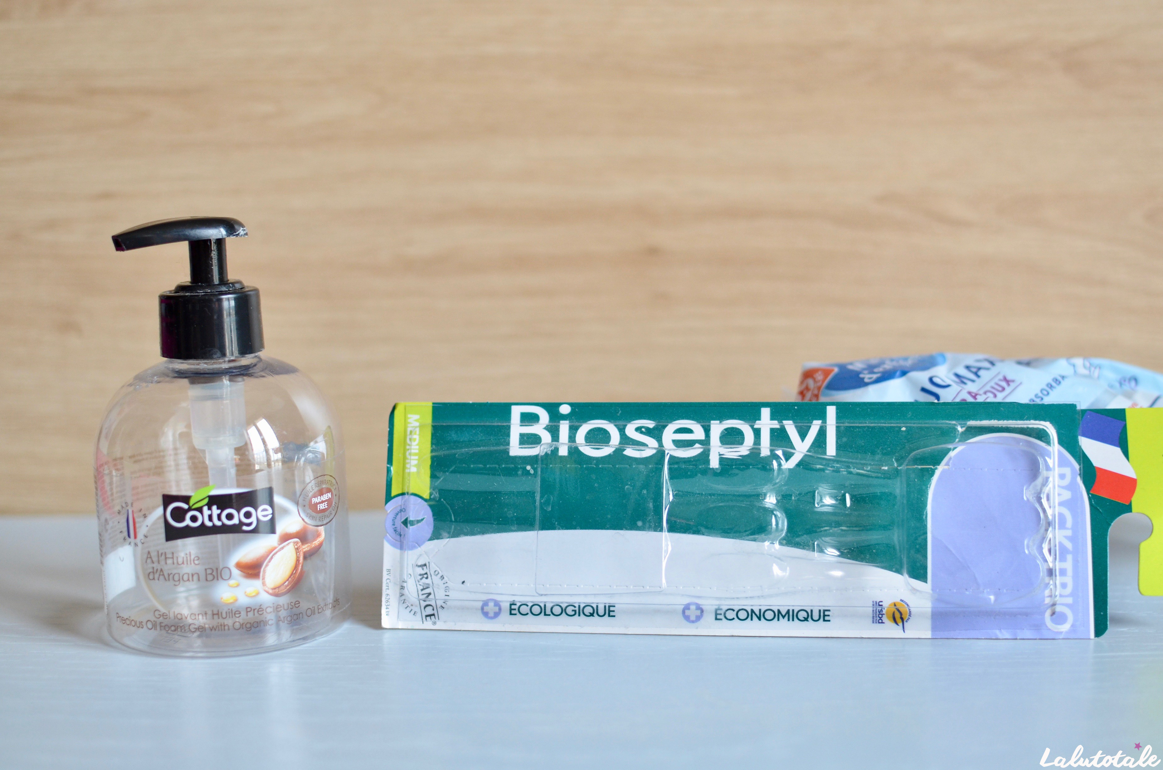 - Une boîte de trois brosses à dents manuelles BIOSEPTYL. J’aime toujours autant ma brosse à dents électrique, mais pour éviter de réveiller Lalutine lorsque je me prépare le matin, j’ai acheté quelques brosses à dents manuelles. ( Bon maintenant elle se réveille à cause du « biiip » tonitruant de ma balance mais ceci n’est pas le sujet )