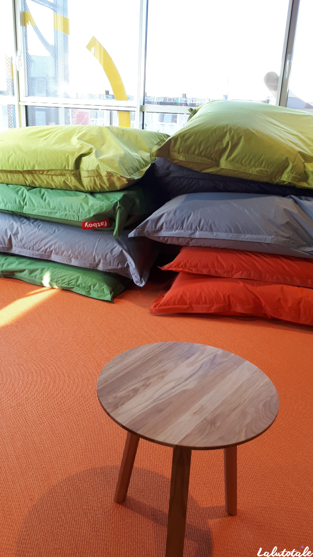 Des dizaines de coussins Fatboy ( best coussins EVER ) pour s’installer confortablement avec son ordinateur portable ; De grandes « tables bar » pour des réunions informelles ; Des poufs et des canapés en veux-tu en voilà ; de grandes salles de réunion chaleureuses à la déco soignée ; des équipements technologiques en nombre pour assurer un travail dans de bonnes conditions ( WiFi gratuit, chargeurs etc etc…).