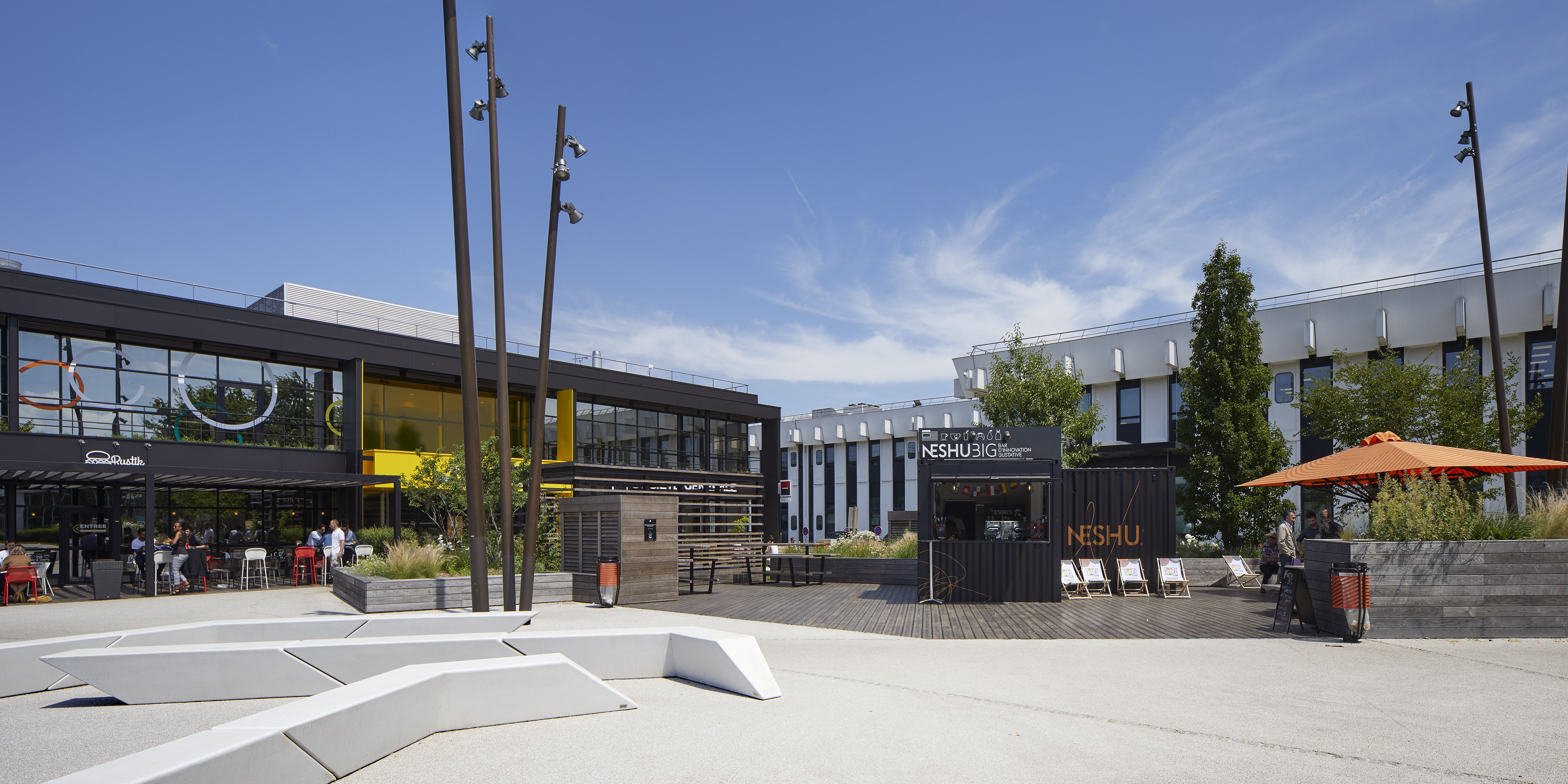 ICADE est donc parti de zéro sur une espace vierge en imaginant une grande place, véritable lieu d’échange et de partage entre tous les salariés du parc. On n’oublie pas une bonne grosse dose de services, avec banques, restaurants, food-trucks et tout le toutim.