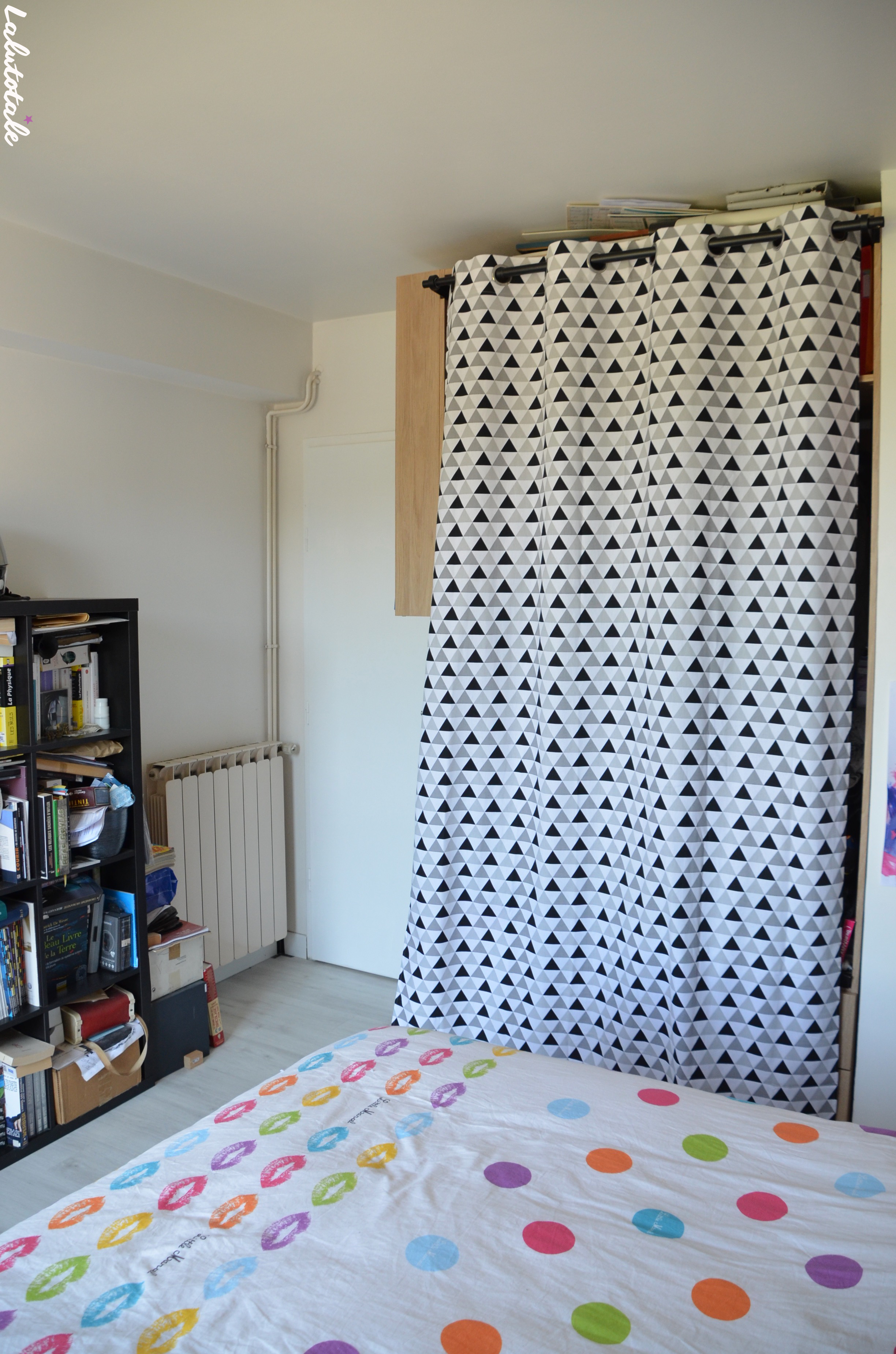 Pour planquer le bordel ( toujours lui ) de nos caissons de dressing, j’ai harcelé demandé à Musclor de fixer une tringle à rideaux dessus. Puis j’ai trouvé ce joli imprimé géométrique chez Leroy Merlin pour une vingtaine d’euros.
