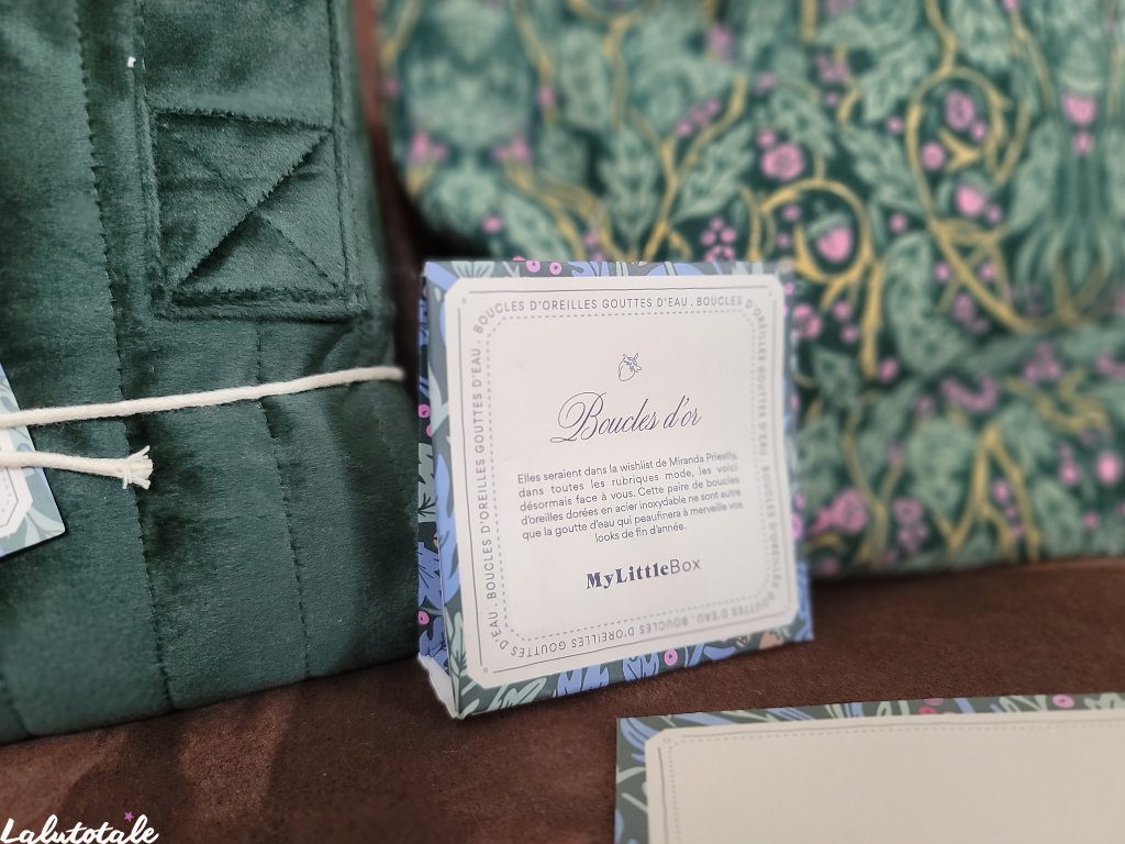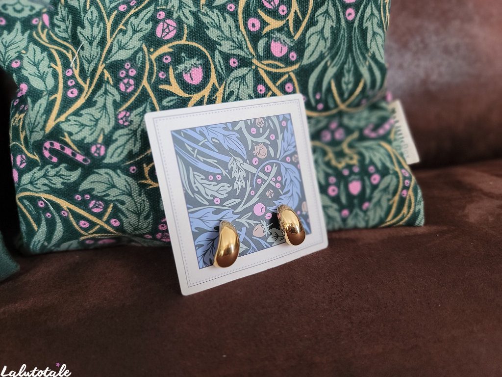 Pour finir, MYLITTLEBOX a complété son duo d’accessoires lifestyle et déco avec un autre accessoire, rien que pour soi ! J’ai découvert en dernier une jolie paire de boucles d’oreille dorées. Bon il semble que l’un des papillons (une attache quoi) ait un soucis puisqu’il ne tient pas sur la tige de la boucle. Je dois en avoir un ou deux de rechange donc c’est pas très grave.
