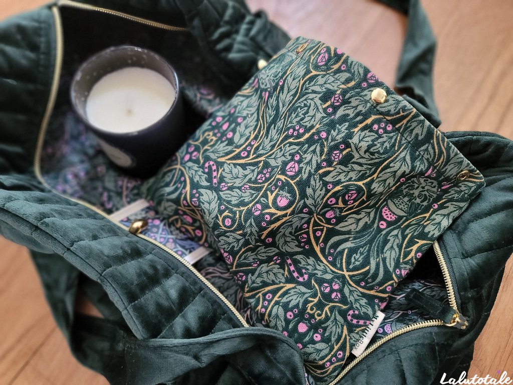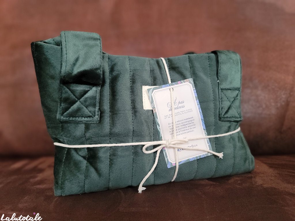 Il s’agit d’un maxi sac zippé en velours. Je ne suis pas adepte du vert sapin au quotidien, et je m’aperçois que c’est un tort : il est absolument CA.NON.