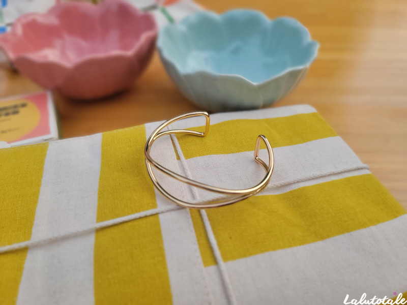 Je me suis ensuite précipitée sur le deuxième carton, beaucoup plus petit cette fois, pour découvrir qu’il s’agissait d’un bijou. Un jonc doré pour sublimer un poignet. Alors sur le design je le trouve vraiment sublime. A la fois simple, sobre mais follement classe, c’est tout à fait le genre de bijou qui me plaît !