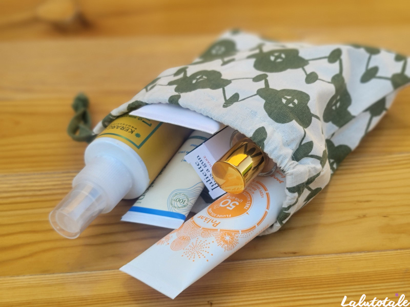 Cachés dans un petit pochon en coton, nous trouvons ce mois-ci 6 produits cosmétiques dont 4 en full-size. Ce qui est quand même énorme, vous en conviendrez. C’est d’ailleurs tellement énorme que tous les cosmétiques ne rentraient pas dans le pochon, lolilol.