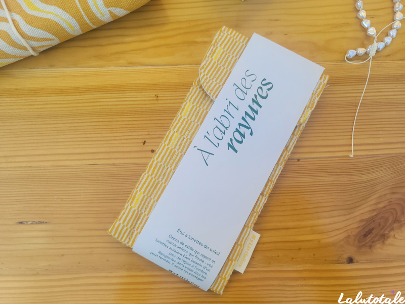 Pour protéger au mieux cette magnifaïque paire de lunettes, voilà que l’on découvre le 3ème accessoire de la box : un joli étui protecteur en tissu ! Matelassé avec un joli fil doré, fermant par un bouton pression métallique, on a en plus la surprise de découvrir à l’intérieur une petite lingette aux couleurs et motifs du dernier accessoire pour nettoyer ses verres.