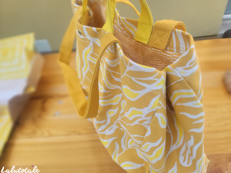 Il s’agit d’un sublimissime sac cabas en coton recyclé. Jaune bien évidemment mais ce serait tellement réducteur comme qualificatif ! Je suis sous le charme du motif du tissu, du choix de coloris de anses et poignées (les une orange, les autres jaune vif) et de sa taille immense !