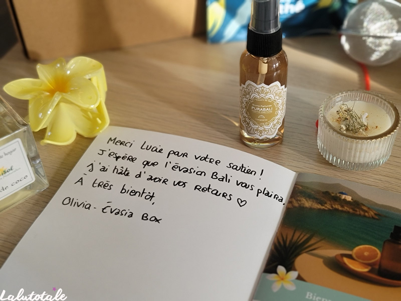 Car figurez-vous que la box EVASIA a été créée par Olivia. Une femme (comme moi), qui jongle quotidiennement entre obligations familiales (comme moi), fatigue (comme moi) et charge mentale (comme moi). Et comme elle, je suis passionnée de voyages mais dans les faits, je voyage peu. (Mais pour des raisons différentes des siennes.)(D’ailleurs si tu es déçue et que tu t’attendais à un récit de voyage à Bali, je rappelle que tu peux découvrir mes dernières pérégrinations dans ma catégorie Lu t’envoie Balader.)
