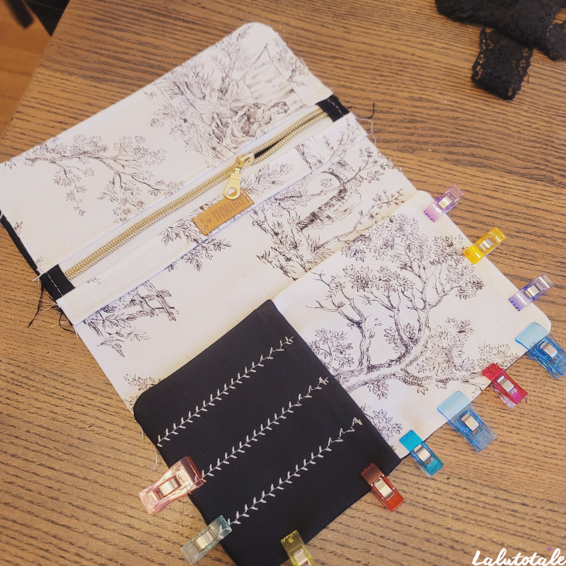 Pour ma part, j’en ai cousu 2 afin de tester les différentes versions de fermeture de la pochette !